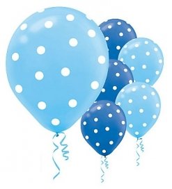 20 festive polka dotted balloons- 10 dark blue and 10 light blue. Inflate to approximately 12 inches each. White polka dot print all around.Features:
