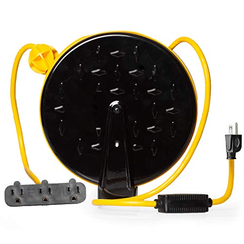 Retractable Extension Cord Reel with 3 Electrical Power Outlets - Multiple Gauges & Lengths to Choose From - Perfect for Hanging from Your Garage Ceiling (16/3 Gauge, 30ft Length - Yellow & Black)