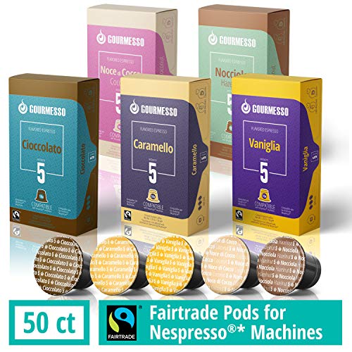 Gourmesso Nespresso Part#: 42008 - 50 Fairtrade Flavored Espresso Capsules Compatible with Original Line Nespresso Pod Machines | Caramel Vanilla Chocolate Hazelnut Coconut Flavored Espresso Pods for Nespresso Capsule Machines