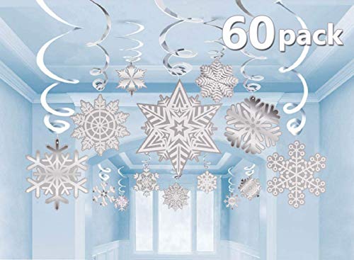 60 Pack Christmas Winter Wonderland Snowflake Hanging Swirls Value Bundle Decorations for Frozen Themed Parties Supplies, White Silver