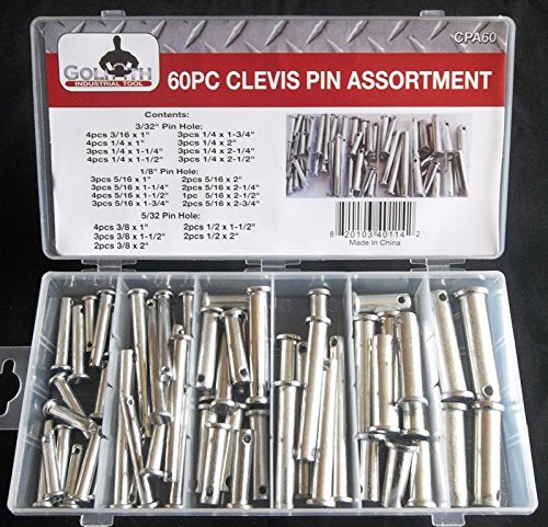 Brand New 60pc Clevis Pin AssortmentSizes And Quantity Include:3/32" Pin Hole:4pcs 3/16 x 1"4pcs 1/4 x 1"3pcs 1/4 x 1-1/4"4pcs 1/4 x 1-1/2"3pcs 1/4 x 1-3/4"3pcs 1/4 x 2"3pcs 1/4 x 2-1/4"3pcs 1/4 x 2-1/2"1/8" Pin Hole: 3pcs 5/16 x 1" 3pcs 5/16 x 1-1/4" 4pcs 5/16 x 1-1/2" 3pcs 5/16 x 1-3/4" 2pcs 5/16 x 2" 2pcs 5/16 x 2-1/4" 1pc 5/16 x 2-1/2" 2pcs 5/16 x 2-3/4"5/32 Pin Hole:4pcs 3/8 x 1"3pcs 3/8 x 1-1/2"2pcs 3/8 x 2"2pcs 1/2 x 1-1/2"2pcs 1/2 x 2"Storage Case Included Use On Tractors, Farm Equipment, Trucks, Cars, Campers, Lawn And Garden Equipment, ATV'SUPCs:
