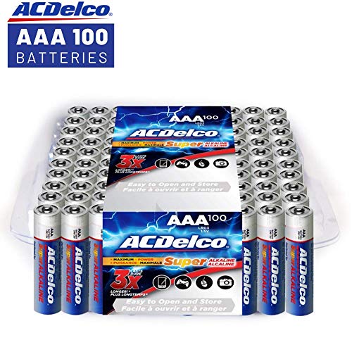 ACDelco AAA Super Alkaline Batteries are equipped with advanced technology you can count on. ACDelco alkaline batteries perform better than the competition in high-drain and super high-drain devices, and they provide consistent discharge performance. ACDelco alkaline batteries are designed for long shelf-life with stainless steel pre-coating that prevents leakage and advanced ingredient formulation that helps maintain power over time. This recloseable storage pack includes 100 AAA batteries great for a variety of household devices, including clocks, remote controls, and toys. The 1.5-volt batteries contain no mercury or cadmium, making them a smart choice for your family and for the environment. A trusted national brand, ACDelco offers a wide variety of batteries you can count on, including alkaline batteries, lithium coin cell batteries, rechargeable batteries, and car batteries.Features:
