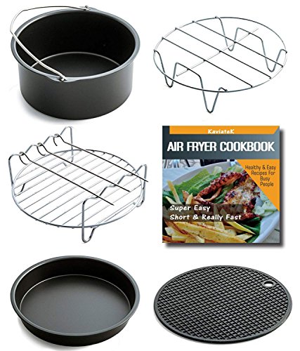 Kaviatek Air fryer Accessories Set of 6---Give your body more healthy choices. And easy to enjoy healthy & delicious food every day. High temperature resistant safety. Air Fryer Accessory KIt Includes: 1 x Cake Barrel 1 x Pizza Pan 1 x Metal Holder 1 x Silicone Mat 1 x Multi-Purpose Rack with Skewers 1 x Air Fryer Cookbook 1 x Exquisite and unique packagingFeatures: