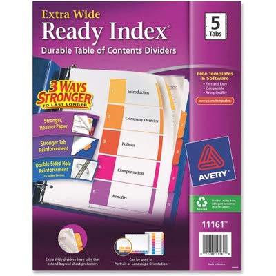 Business moves fast, so you need to find important information in a hurry. These Ready Index Extra-Wide Table of Contents Dividers help you stay organized so you can locate important documents quickly and easily. They feature five preprinted, numbered multicolor tabs that can be used in either landscape or portrait format. Now Three Ways Stronger to Last Longer with stronger, heavier paper, added tab reinforcement, and double-sided hole reinforcement on tabbed dividers. And with free templates from avery.com, you can customize the included table of contents page and print it on your laser or inkjet printer in minutes.Features: