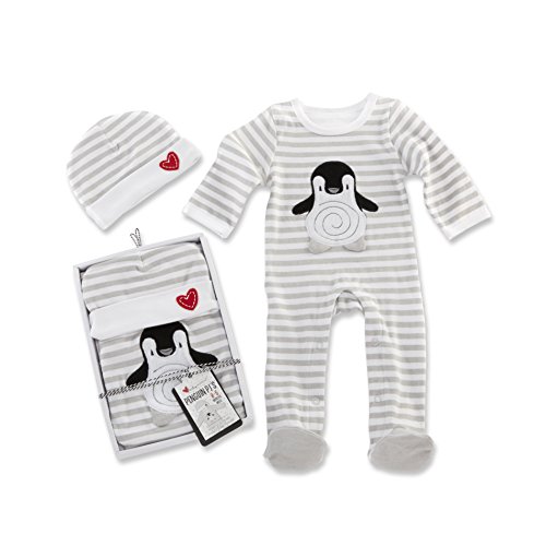 - GIFT SET - A cheerful, chubby penguin adorns this brrrr-eathtaking baby footie pajama gift set with a gray-and-white bodysuit and matching cap lovingly accented with a red-felt stitched heart