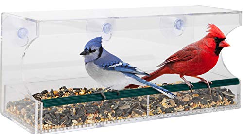 - ENJOY INCREDIBLE CLOSE-UP VIEWS OF YOUR FAVORITE LOCAL BIRDS. Window Bird Feeder is made from strong clear acrylic so you can easily identify birds by their markings. Birds are so close, you can watch them split open seeds! Mount on a window close to where you spend lots of time, so you can bird watch throughout the day.