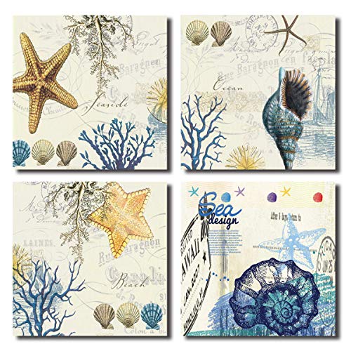 Hlj Art Part#: 695301014285 - Blue Seashell Starfish Wall Art Decor Contemporary Seascape Canvas Print Painting for Home Bathroom (Blue, 12x12inchx4pcs)