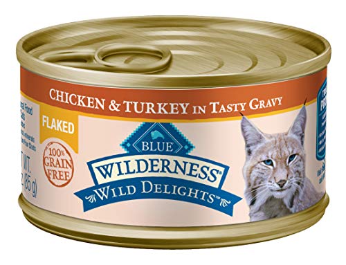- Contains (24) 3-oz cans of Blue Buffalo Wilderness Wild Delights High Protein Grain Free, Natural Adult Flaked Wet Cat Food, Chicken & Turkey
