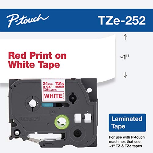 Brother Part#: TZE252 829580956961 - Brother Genuine P-Touch TZE-252 Tape, 1" (24 mm) Standard Laminated P-Touch Tape, Red on White, Laminated for Indoor or Outdoor Use, Water-Resistant, 26.2 ft (8 m), Single-Pack