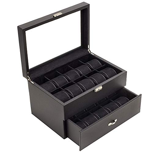 Caddy Bay Collection Carbon Fiber Pattern Glass Top Watch Case Display Storage Box Chest Holds 20 Watches with High Depth for Larger Watches