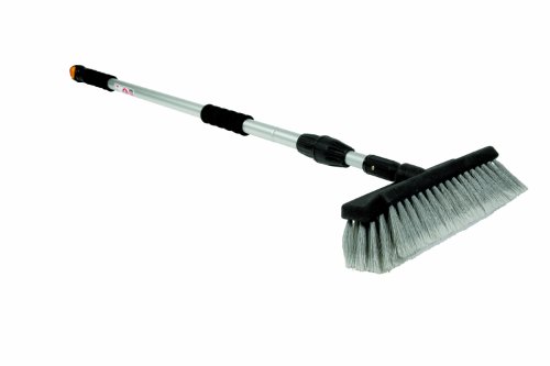 Camco’s RV Flow-Through Wash Brush with Adjustable Handle is the perfect tool for washing your RV, house and more. The handle adjusts from 43-inches to 71-inches long and includes a standard garden hose connection and an on/off button to control water flow through the brush head. A 10-inch wide soft bristle brush head that locks ensures that the wash head won’t spin while delivering maximum cleaning power. The brush’s rubber corners protect what you are washing.Features: