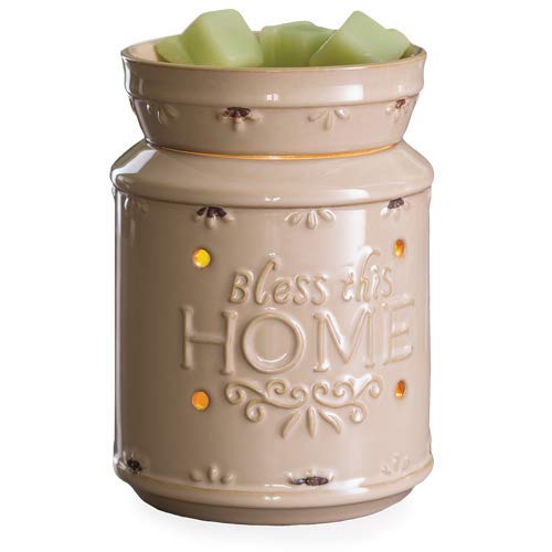 A French country style ceramic warmer with debossed "Bless this Home" in vanilla cream. Uses a soft halogen bulb to release the scent of your favorite fragrance. Dish is removable and includes a warming bulb.Features: