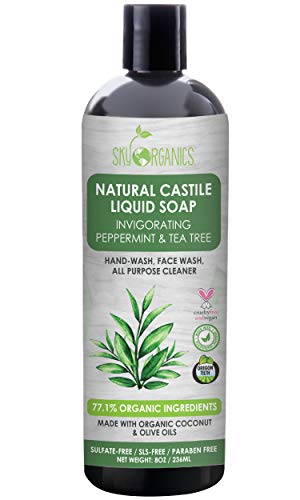 Your New Go-To Household + Beauty Essential Sky Organics Organic Acne Body Wash Castile Liquid Soap is a do-it-all plant based cleanser that boasts a variety of practical and beauty uses. Non-toxic, non-GMO, and NSF certified organic, our all natural Castile Soaps can be used as a natural alternative to conventional face washes, hand soaps, dish soaps, and more! Our Castile Soaps can be easily diluted in water to create your own all-natural wood-cleaners, floor cleaners, and all-purpose cleaning sprays. You can even combine our Castile Soap with your favourite Sky Organics essential oils to create your own personalized scent! Use as a: Hand and Body Wash, Dish Soap, Floor Cleaner, Wall + Wood Cleaner, Laundry Detergent, and MORE! Made with the Finest Natural Ingredients Made with 100% pure and organic olive, coconut, and sunflower seed oils, our all natural, highly concentrated Castile Soap moisturizes skin as it cleanses to keep skin soft and fresh. Naturally fragranced with 100% pure Peppermint and Tea Tree essential oils to purify and invigorate skin, our Peppermint Tea Tree Castile Soap contains zero synthetic or chemical ingredients while still remaining soft and gentle on skin. Ingredients - Organic Cocos Nucifera (Coconut) Oil, Organic Olea Europaea (Olive)Fruit Oil, Organic Helianthus Annuus (Sunflower) Seed Oil, Potassium Hydroxide, Mentha Piperita (Peppermint) Oil, Melaleuca Alternafolia (Tea Tree) Leaf Oil, Organic Aloe Barbadensis Leaf Juice, Citric Acid, Organic Butyrospermum Parkii (Shea Butter), Rosmarinus Officinalis (Rosemary) Flower Extract.Features: