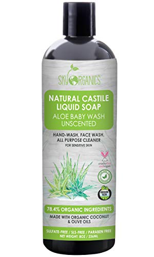 Your New Go-To Household + Beauty Essential Sky Organics Natural Castile Liquid Soap is a do-it-all plant based cleanser that boasts a variety of beauty and household uses. Non-toxic, non-GMO, and NSF certified organic, our all natural Castile Soaps can be used as a natural alternative to conventional face washes, hand soaps, dish soaps, and more! Our Castile Soaps can be easily diluted in water to create your own all natural wood-cleaners, floor cleaners, and all purpose cleaning sprays. You can even combine our Castile Soap with your favorite Sky Organics essential oils to create your own personalized scent! Use as a: Hand and Body Wash, Dish Soap, Floor Cleaner, Wall + Wood Cleaner, Laundry Detergent, and MORE! Made with the Finest Natural Ingredients Our Unscented Aloe Vera infused Baby Castile Liquid Soap is 100% fragrance and sulfate-free, making it an ideal soap for babies' delicate skin and for those with reactive, sensitive skin types. Made with 100% pure and organic olive, coconut, and sunflower seed oils, our all natural, highly concentrated Castile Soap moisturizes skin as it cleanses to keep skin soft and fresh. Our unscented formula is also an ideal choice for those who want to use the soap to create their own DIY household products by adding their own essential oils. Ingredients - Organic Cocos Nucifera (Coconut) Oil, Organic Olea Europaea (Olive)Fruit Oil, Organic Helianthus Annuus (Sunflower) Seed Oil, Potassium Hydroxide, Organic Aloe Barbadensis Leaf Juice, Citric Acid, Organic Butyrospermum Parkii (Shea Butter), Rosmarinus Officinalis (Rosemary) Flower Extract.Features: