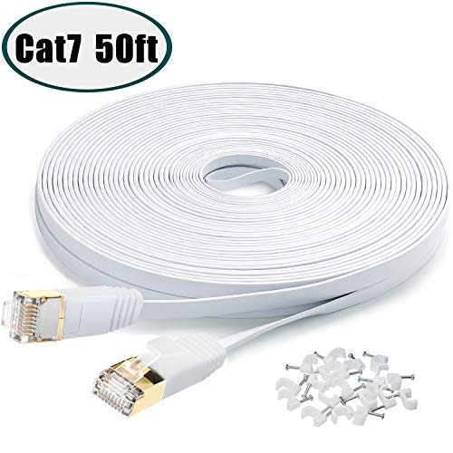 Cat7 Flat Ethernet Cable, 50 Ft 10 Gigabit High Speed Solid Computer Network Cord with Snagless Rj45 Connectors for Xbox,PS4,Modem,Router,Networking Switch Faster Than Cat5e Cat5 Cat6 Cable,White