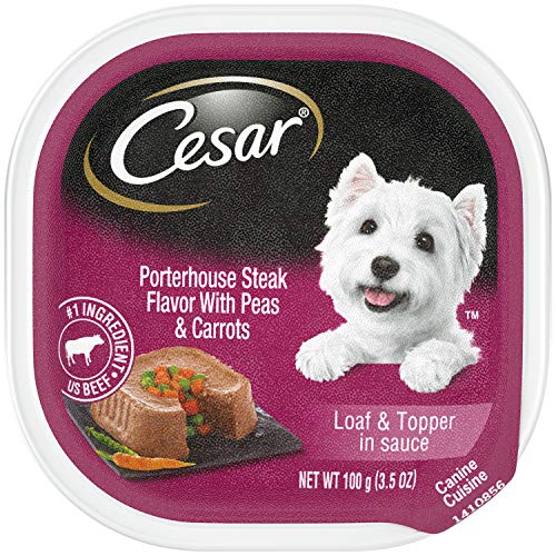 - Contains twenty-four (24) 3.5 oz. trays of CESAR Wet Dog Food Loaf & Topper in Sauce Porterhouse Steak Flavor With Peas & Carrots