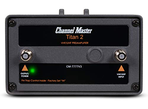 The Channel Master CM-7777V3 Titan 2 television antenna booster (preamplifier) will amplify digital and HD signals received by your antenna. This preamplifier is a high gain, low noise preamplifier used for weak signal areas to allow a weak signal that is present at the antenna to be amplified to a viewable strength. This TV antenna preamplifier is designed for use in the weakest of signal areas only. Keep in mind, due to its ultra high gain amplification, it can be subject to overdriving issues when used in areas with fairly strong signals present. In areas with a mix of both strong and weak signals, the Channel Master CM-7778V3 Titan 2 Medium Gain Preamplifier is a better choice. Preamplifiers are also used if you anticipate distributing your signal with a digital splitter to multiple televisions throughout your house as splitters reduce the signal strength available at each output.Features: