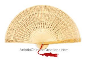 Chinese Sandalwood Fan: Made of sandalwood. This beautiful Chinese folding fan is decorated with carved pattern and carry a light sandalwood scent. Each fan comes with a tassel. Measures 8" by 13-3/4" when fully opened. Hand made.Features: