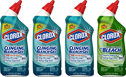Clorox Toilet Bowl Cleaner with Bleach is a powerful disinfecting gel formula that deep cleans and kills 99% of germs. This variety pack contains three bottles of thick Clinging Bleach Gel in a Cool Wave scent that clings to all areas of your toilet 50% longer versus Clorox Toilet Bowl Cleaner Tough Stain Remover and one bottle of Toilet Bowl Cleaner in a Fresh scent to conquer all of your toilet stains. These toilet bowl cleaners deep clean and eliminate odor-causing bacteria so stains and odors don't stand a chance. The unique dispensing nozzle easily delivers that cleaning power under the bowl rim. Clorox Toilet Bowl Cleaners with Bleach are made with a non-abrasive formula that will not scratch surfaces and are safe to use in septic systems. Get better bowl coverage and sparkling toilets with Clorox Toilet Bowl Cleaners.Features: