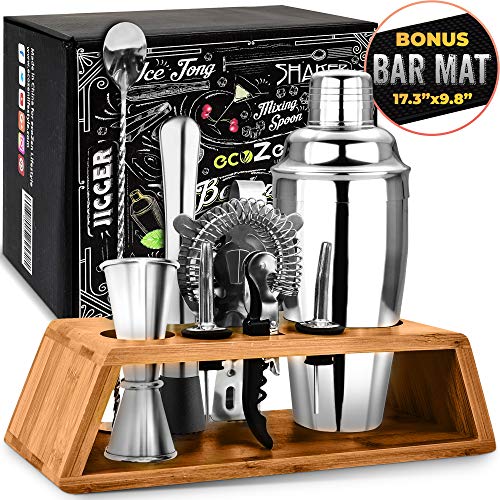 - FREE $10 BAR MAT: No more dealing with messy countertops; no more glasses slipping off the counter. Every cocktail mixing set comes with a bonus 17.3" x 9.8" bar mat, with grooves for containing any spills. Save yourself $10 and get home bar essentials you'll love.