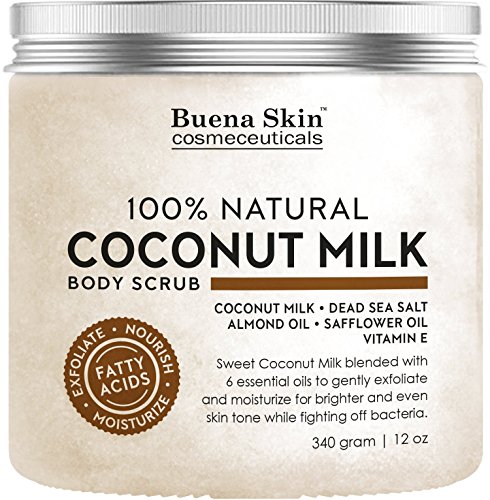 - ►ALL NATURAL WITH NO CHEMICALS - Buena Skin Sweet Coconut Milk Scrub Has Powerful Nutrient Rich Ingredients Including Sweet Coconut Milk, Dead Sea Salt & 6 Essential Oils to Gently Exfoliate and Moisturize For Brighter And Even Skin Tone While Fighting Off Bacteria