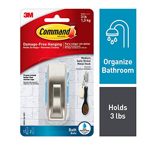Command Metal Hooks with Water Resistant Strips allow you to keep your bathroom organized both inside and outside of the shower. The hook stands up to hot, wet and humid environments and sticks to a variety of surfaces, including glass, mirror, tile, fiberglass, wood and painted surfaces. Tested and proven to hold better than suction cups, it is easy to apply and come off cleanly without damage. Repositioning is easy with assorted water resistant refill strips. Great for bathroom organization including guest and kids' bathrooms, renters and dorm life!Features:
