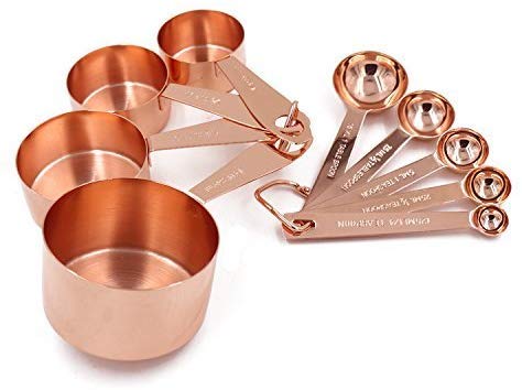 Package Quantity:9 | Size:Extra Sturdy Handles, Set of 9 CONTAINS ALL SIZES YOU NEED CUPS: 1 cup (240 ml), 1/2 cup, 1/3 cup, 1/4 cup. SPOONS: 1 table-spoon (15 ml), 1/2 table-spoon, 1 tea-spoon (5 ml), 1/2 tea-spoon, 1/4 tea-spoon. CRAFTED FOR UNPARALLELED BEAUTY The beauty of these cups and spoons is beyond measure. Crafted individually, the outer mirror polish and inner satin polish give them a luxurious look that nobody else has. These are by far the most attractive cups and spoons on the market, immensely pleasing to the eyes. SUPERIOR QUALITY FOR EASY USAGE AND STORAGE Each of the 9 cups and spoons is packed individually to make sure no damage will happen during transport. Cup and spoon sizes are precise and clearly engraved (stamped) into the stainless steel, so they are easy to read and will never wash off or fade like printed ones. Long and wide ergonomic handles make for a perfect grip, very comfortable to use. The edges are nicely deburred, so no worries about scratching yourself. Handles are long enough to fit well into spice jars and deeper containers. Flat bottoms are very stable and well-balanced, so no worries of tipping over. Store them stacked in a drawer, hung on hooks, or attached to a magnetic bar. ***CAUTION*** - HAND WASH ONLY! Not for dishwasher, which could damage the copper plating! MADE TO LAST Made from high-quality stainless steel to endure daily use and giving no chance for any rust. Pretty hefty in the weight department, so the handles will not bend (if you hold close to the cup), even when used for dense/heavy ingredients.Features: