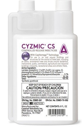 Cyzmic CS Controlled Release Insecticide controls tough pests like darkling beetles, ticks, flies, fleas, scorpions, bed bugs, and many more. Contains 9. 7% Lambda-Cyhalothrin. Available in 8 fl. oz., and 1 quart.Features: