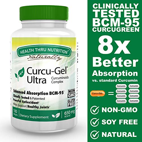 Health Thru Nutrition Part#: 10154-180 014654953148 - Curcu-Gel Ultra 650 mg BCM-95® (CURCUGREEN®) Enhanced Absorption Bio-Curcumin Complex (Soy-Free & Non-GMO) (500mg Total Curcuminoids with Essential Oils of Turmeric Rhizome) 180 Softgels