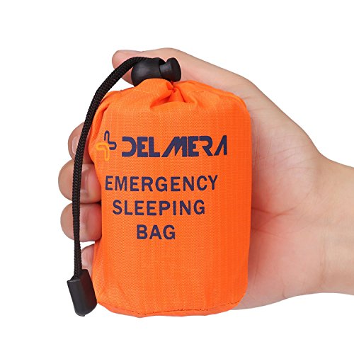 - ULTRA LIGHTWEIGHT & COMPACT SLEEPING BAG-Dimension: 3.08 ft x 6.73 ft(37*80.7 inches), enough to accommodate an adult; Lightweight at 4.6 oz, it's easy to carry. Small enough to fit in the palm of your hand, Delmera's Bivy survival sleeping bag comes rolled up inside handy nylon stuff drawstring bag sack so you can store it nearly anywhere. First aid sleeping bag is guaranteed, not easy to tear, good waterproof performance, strong wind resistance, strong insulation performance