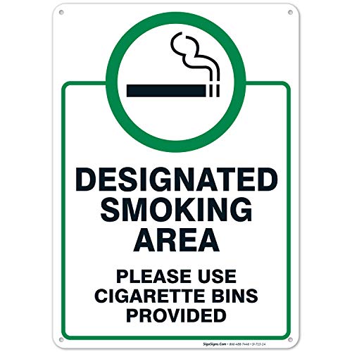 - DESIGNATED SMOKING AREA SIGN -Designated Smoking Area Sign, Use Cigarette Bins Sign, 10x14 Rust Free Heavy 0.40 Aluminum, UV Protected, Long Lasting Weather/Fade Resistant, Easy Mounting, Indoor/Outdoor Use!