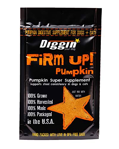 Firm Up Anti-Diarrheal. Pumpkin + Apple Fiber for digestive support in dogs and cats. Antioxidant rich blend to support healthy digestion. One 4oz bag will mix with water to make over 35oz of supplement. No more cans of pumpkin that go to waste in the fridge. Use what you need when you need it. Great for travel. Firm Up. supports regularity, happiness and health in your pet. Firm Up. was created because we "dig" your pet... and your carpet. Firm Up. is 100-percent grown, harvested, made and packaged in the USA... it is also packaged in BPA free resalable pouches that are made in the USA. Can be fed wet or dry To feed dry simply add one dose to feedings once a day. To feed wet, simply mix one part Firm Up. to one part water and add to feedings once a day. All size dogs and cats can benefit from Firm Up..Features: