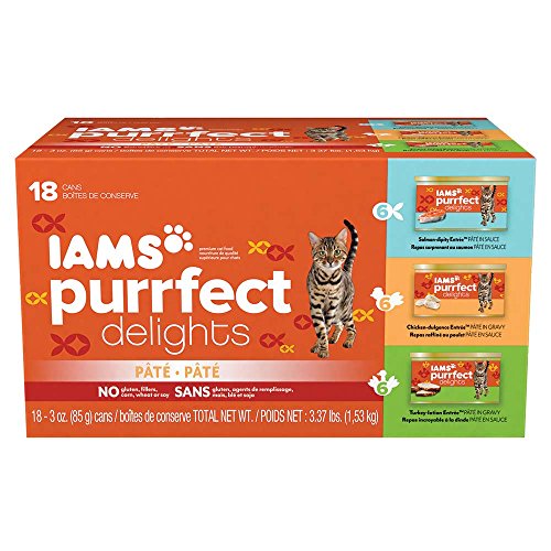 Delight your cat with the real meat blended into every bite of IAMS PURRFECT DELIGHTS Pate Variety Pack With Salmon-dipity, Chicken-dulgence, and Turkey-lation Entrees in Gravy Wet Canned Cat Food. With no added gluten, artificial flavors, corn or soy, our hearty wet cat food provides high-quality protein in a complete and balanced meal. Give your cat a meal they will remember, and one you can trust, with IAMS PURRFECT DELIGHTS Wholesome Wet Food for Cats.Features: