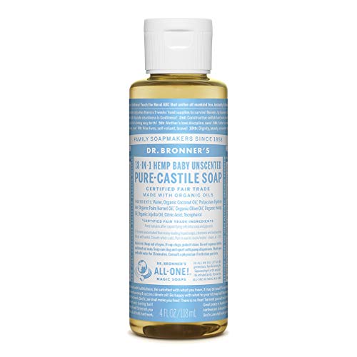 Dr. Bronners - Pure-Castile Liquid Soap (Baby Unscented, 4 Ounce) - Made with Organic Oils, 18-in-1 Uses: Face, Hair, Laundry, Dishes, For Sensitive Skin, Babies, No Added Fragrance, Vegan, Non-GMO