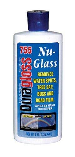 Duragloss nu-glass is a blend of cleaners and selected abrasives formulated to remove water spots from glass surfaces without scratching. Duragloss nu-glass can be applied by hand or mechanical buffer. Many drivers are afraid to polish their vehicle's windshields for fear of scratching it. Duragloss nu-glass is a safe way to polish glass without scratching, distorting or damaging the glass. This gentle cleaner removes what is on the glass without harming the glass itself. Before your reach for steel wool or some harsh solvent, try Duragloss nu-glass. It safely removes water spots, tree sap, bugs and stubborn road film using a combination of cleaners and abrasives. The abrasives smooth the outermost glass by polishing away rough water spots and dislodging stubborn bugs and sap. The cleaners remove films and dirt that cloud your visibility. Duragloss nu-glass contains lubricants to protect the glass from abrasion. Apply it by hand or with a buffer to easily remove imperfections and improve the clarity of automotive glass. If you don't have a buffer, a great alternative is the spot buffs kit, which includes 4 inch pads and a backing plate for use on an electric drill, not included. Use the white polishing pad on glass. It enhances the smoothing ability of the polish but it will not scratch the glass. If applying by hand, use a polyfoam applicator. Once you've polished your vehicle's glass, use Duragloss rain repel 751, not included, to seal and protect the glass. Remove water spots, tree sap, bugs and road film without scratching. Duragloss nu-glass is a safe, practical glass polish that really works.Features:
