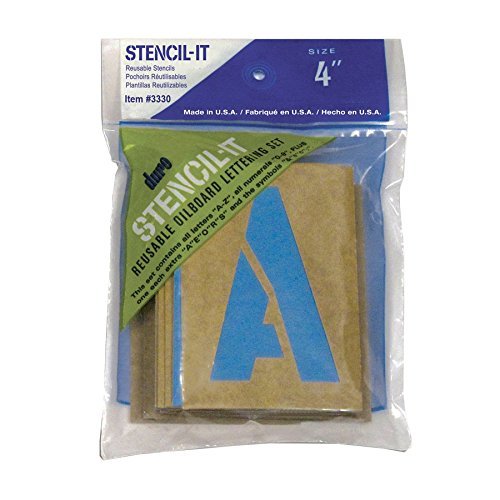 Duro Stencil-It sets are made of sturdy oil board, a long lasting material fused with drying oils to resists bleed-through and provides sharp clean edges that resist fuzzing even after repeated use. This 4-Inch set contains all capital letters: A thru Z, all numerals: 0 thru 9, plus one extra letter of each: A, E, O, N, R and S. The set contains the symbols: &, $ and cent sign and the symbols to create a colon, semi-colon, dash, comma and period.Features:
