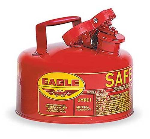 The Eagle Type I galvanized steel safety can is used to store, transport, and dispense flammable liquids safely and has a single spout for filling and pouring. The can is made of 24-gauge galvanized steel, which is resistant to rust, dents, and certain chemicals. Gauge is a measure of thickness (the lower the gauge, the thicker the material). The powder-coated finish resists scratches, chipping, fading, and other wear. A flame arrestor helps prevent liquids inside the can from igniting and keep flames from spreading. The spout cap self-closes to help prevent leaks or spills. The cap assembly opens automatically to vent internal vapors. A trilingual safety warning label alerts users to the can's contents. This safety can may be available in different colors (blue for kerosene, green for oil or other combustibles, red for gasoline, or yellow for diesel) to separate, store, and identify different liquids. This product is FM Approved as a safety can used for handling flammable liquids in quantities of 5 gallons or less. It complies with Occupational Safety and Health Administration (OSHA) Standard 1910.106 for the safe storage and handling of flammable liquids. It meets National Fire Protection Association (NFPA) Code 30, which provides safeguards to reduce the hazards associated with the storage, handling, and use of flammable and combustible liquids. It is Underwriters Laboratories (UL) Listed and meets UL safety requirements.