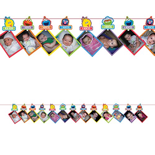 A baby's first year is so much fun. Show everyone how much fun it is with the Elmo Turns One Photo Garland. It features a 12-foot long ribbon with Sesame Street cutouts and 13 clothespins. Attach a photo of your child on each clothespin ? one per month from birth to the first birthday ? and hang it up at your party.Features: