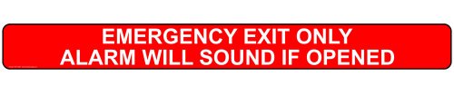 This self-adhesive EMERGENCY EXIT ONLY ALARM WILL SOUND IF OPENED permanent label/sticker is easy to apply - just peel and stick. It is printed in color with a red background and English text to make your alarm will sound message clear. Our labels have easy-to-remove backing and are UV, chemical, abrasion and moisture resistant. They have permanent adhesive and are suitable for use at temperatures from -40 to +176 F. ComplianceSigns labels are made in the USA and commonly used in industrial, commercial, public and private settings.Features: