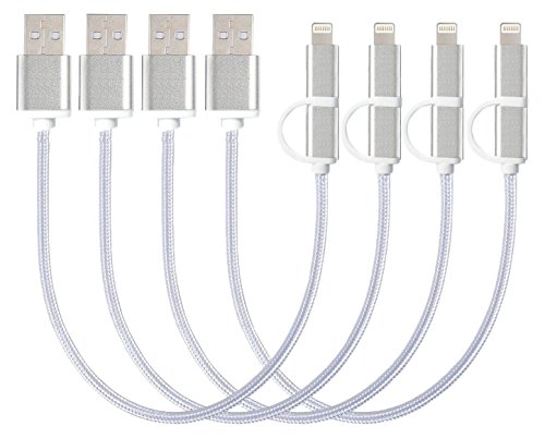 A cable you can count on: We bent the end of this cable over 1000 times and saw no damage or change in performance. Heat-resistant connectors ensure complete safety and reliability. 4pack 1ft 2 in 1 extra short charging cables: These amazing 4pack 1ft 2 in 1 extra short charging cables are great replacements for your original 3ft cable and add another four at home, workplace for your charging station, power bank or travel. Fashion and durable: 1ft/12in 2 in 1 popular golden syncing and charging cable features a revolutionary design which allows you charging with iOS or android cellphones & tablet. Using high-quality tangle-free nylon braided jacket and core material. Device compatibility: Widely compatible with most apple / android / windows smartphones/tablets including iPhone 6s plus/6s/ 6 plus/ 6/ 5s 5c 5, iPad air mini, iPod touch Nano, Samsung galaxy, HTC, Motorola, lg, and more.Features: