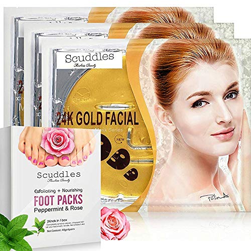 Scuddles Part#: SC-BL-04N 068888768733 - Exfoliating Nourishing Foot Mask - Foot Peel Mask Includes 4 Pairs Of Scented Peppermint & Rose Foot Gloves Peels off Callus - Dead Skin BONUS 3 Pack Of 24K Gold Collagen Gel Masks Sheets