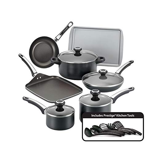 The Farberware High Performance Nonstick 17 Piece Cookware Set makes it easy to turn out complete, delicious meals. Farberware has brought performance, convenience and reliability to countless kitchens for over a century, and this cookware set continues that tradition for a new generation. Crafted from heavy duty aluminum that heats evenly, the nonstick saucepans and Dutch oven feature long lasting nonstick for effortless food release and easy cleanup. Both frying pans and the griddle boast the unique dimpled surface of the SmartGlide(r) Nonstick System with top quality nonstick, which improves durability and creates air pockets that transfer heat to food quickly. Use the six convenient Prestige(r) nylon cooking utensils included with the cookware set to flip pancakes on the griddle, stir marina in a saucepan or serve angel hair pasta from the Dutch oven. Double riveted handles on the cooking set offer a confident grip, and shatter resistant glass lids seal in heat and moisture. The cookware is oven safe to 350 degrees F, the cookie pan is oven safe to 450 degrees F, and the entire cookware set is dishwasher safe for convenience. Busy cooks will appreciate the convenience of the Farberware High Performance 17 Piece Nonstick Cookware Set that helps get memorable meals on the table in no time.Features: