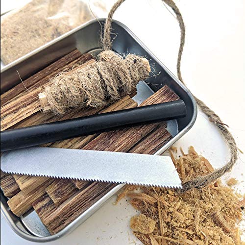 Ships from USA. American owed & operated. Tin full of 100% natural fatwood fire starting sticks, hand cut in the USA. Jute soaked in natural hot soy wax, produced from soy beans by American farmers, 100% natural fatwood chips, plus a ferro rod that last for 1000's of strikes and 3in striker. l have used this kit while backpacking the Pacific Crest Trail from California to Canada. You can start a fire very quickly in all kinds of weather. Fatwood has been use since the 1600's to start fires. Naturally soaked in the trees resin. No chemicals used here. Ignites instantly burns very hot. Cut from dead pine stumps left after logging, we never cut live trees. Use to start a fire anywhere,camp fires,wood stoves. Perfect for your survival kit, backpacking, bug out kits, hiking, preppers or camping. Fatwood never lets you down in emergencies..... Jute twine soaked in wax. Jute lights on fire very quickly with the sparks from a ferro rod and is long burning, just cut off a 2in piece and fray the ends. Lights in all kinds of weather..... Fatwood chips saves time, no need to make tinder it is already made for you. Each kit is put together by hand for you, in the seaside village of Ventura, California. Thanks for looking. See you on the trail. Steve KaeserFeatures: