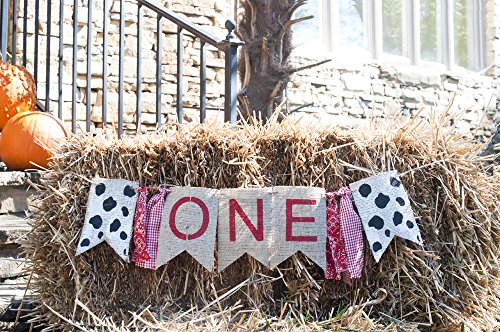 A chic and beautiful farm One banner that is perfect for your baby's 1st Birthday Party! This First Birthday Decoration includes: 2 cow print image flags and 4 fabric strips with letters spelling the word one.* STYLISH: This farm themed 1st birthday banner can be used as a high chair banner or hung as a regular banner. Perfect to create memories of your one year old's birthday party.