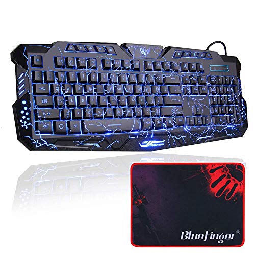 Gaming Keyboard, BlueFinger Mechanical Computer Keyboard USB Wired LED 3 Color Red/Blue/Purple Backlit Gamer lighted Keyboard with Customized MousePad