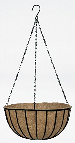 Gardman R409 Black Traditional Hanging Basket with Coco Liner, 16" Diameter. Sturdy round hanging grower basket constructed of strong steel rod with a tough black vinyl coating for long-life. Attached to basket for trouble free hanging are: a black vinyl coated “S” hook and three heavy-duty black vinyl coated steel chains. A pre-formed coco liner is conveniently attached to basket for easy filling. 8” depth provides excellent soil volume and a flat base assures tip-free filling. Coco fiber provides superior drainage and aeration promoting fuller and healthier plant development. Planting tip: adding a plastic liner will help hold moisture in so you can water less often. Use something as simple as a grocery sack. Poke holes in the plastic liner to allow planter to drain adequately. **Replacement coco liner (sold separately) is Gardman model R585. Dimensions: 16” Long x 16" Wide x 8" High. Gardman "Bring your garden to life"Features: