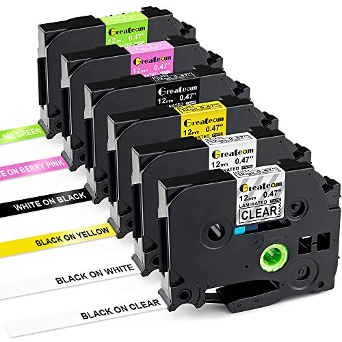 - Greateam 12mm 0.47 Label Tapes 6 Pack Combo Set Compatible for Brother TZe Label Maker Tape TZe131 Black on Clear, TZe231 Black on White, TZe631 Black on Yellow, TZe335 White on Black, TZe-MQP35 White on Berry Pink, TZe-MQG35 White on Lime Green. 12mm (1/2") x 8m (26.2ft) TZe Color Tape.Material: ABS.