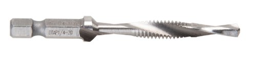 Drill/tap high-speed steel bit, split point with web thinning. High quality hex shank to ensure strong connection to drill chuck. Complete hole drilling, tapping and deburring/countersinking in one operation with power drill. Designed to tap up to 10 gauge metal. Back taper or deburr/countersink beyond tap to prevent thread damage from over-drilling.Features: