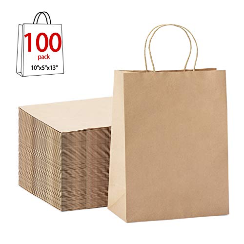 GSSUSA 100Pcs 10" x 5" x 13" Brown Kraft Paper Bags Gift Bags with Handles, Shopping Durable Reusable Merchandise Retail Bags