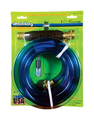 All-in-one kit contains: 10' Hose, 1 brass Adapter, 1 model 186 drain King. For use in kitchen sink, bathtub and shower, or washing machine drains. Perfect for multi-story units. Great for watering indoor plants. Comes with unclogger and faucet adapter. For 1-1/2" To 3" Drains.Features: